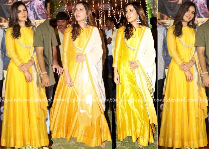 While at a press meet in Hyderabad, Raashi was photographed in an anarkali by Saisha. Keeping her hair and make-up simple, she rounded out the look with a pair of oversized earrings. She looked nice.