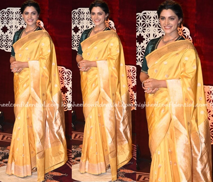 Saiyami was seen a jewellery brand’s Navratri celebrations in a yellow Benarasi sari from Raw Mango that she wore with a green blouse (also Raw Mango) and gajra in her hair. She looked lovely in it.