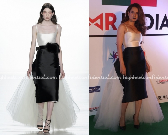 Kangana picked a Sabyasachi kanjeevaram sari to wear to the Umang concert on Saturday evening, pairing it with a ruby and emerald choker and studs that coordinated with the color of the sari. I would’ve liked her to go either/or on the jewellery but she looked nice.