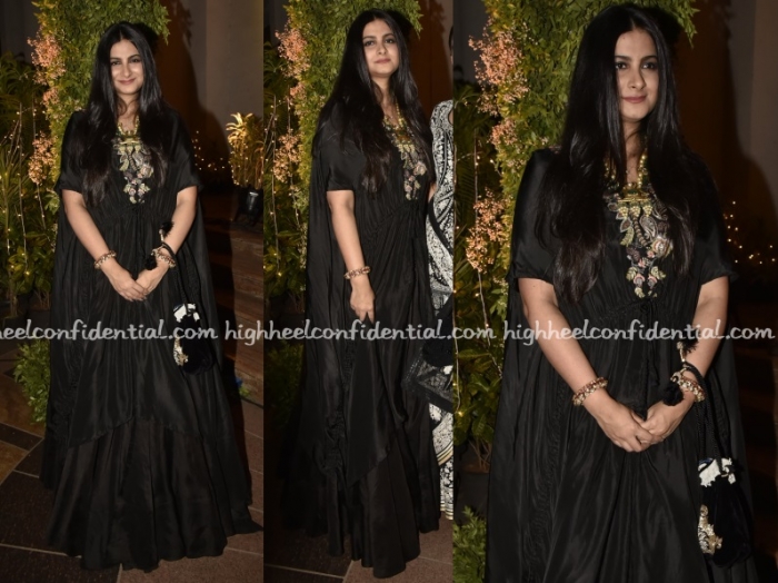 Rhea also attended the Saudamini Siddharth reception on Saturday evening but opted to wear separates from the family’s favorite label, Anamika Khanna. The kurta and skirt may not be everyone’s cup of tea but that wasn’t the issue here. It was the hairdo that covered 90% (Ok, maybe I exaggerate) of her face. An updo would’ve worked so much better here.