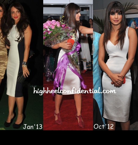 Wearing variations of the Stella McCartney illusion dress were Seema and Priyanka at their events with both finishing off their looks with a hint of red. Seema did red lips while Priyanka went for a red clutch and maroon suede sandals.