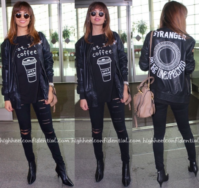 Teaming her Bershka jacket with a tee from Shein and pair of distressed denims, Esha jetted out of Mumbai. Her choice of accessories included studded ankle-boots and a Chloe bag. Like what you see?