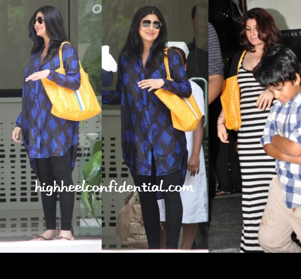 We had two recent Goyard sightings, first on new mum Shilpa and then on expectant mum Twinkle. While Shilpa stepped out of the hospital wearing a Bungalow 8 shirt and tights, Twinkle paired her Goyard with a striped maxi and a black cardigan while catching a movie at PVR.