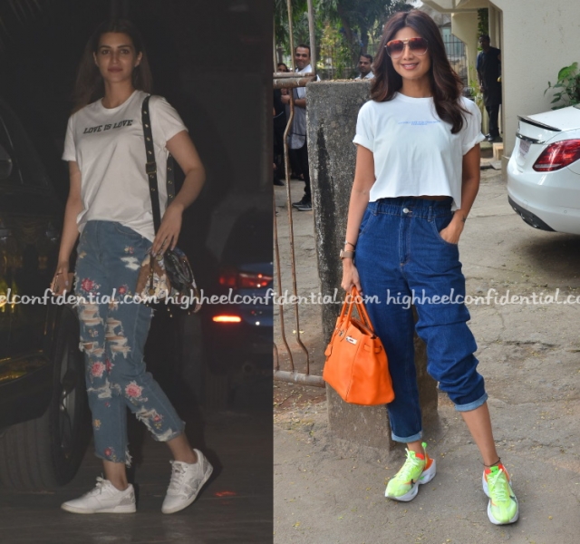Wearing a Yousef Akbar dress that featured a thigh-high slit and a matching jacket, Shilpa attended a recent awards evening. Diamond jewelry and bling-y strappy Louboutins rounded out her look.
