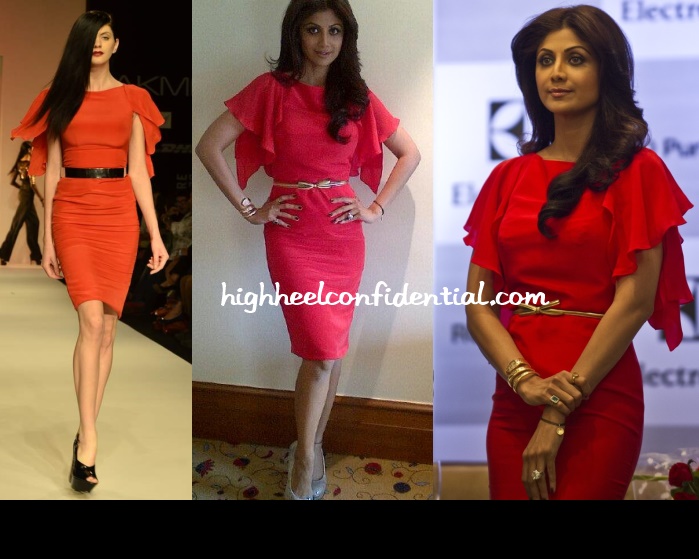 In a Rajat Tangri sheath, Shilpa put in an appearance at a recent event. She opted for a slim bow belt instead of the one presented on the runway and finished out the look with a Bvlgari watch and nude pumps. She looked good methinks, you?