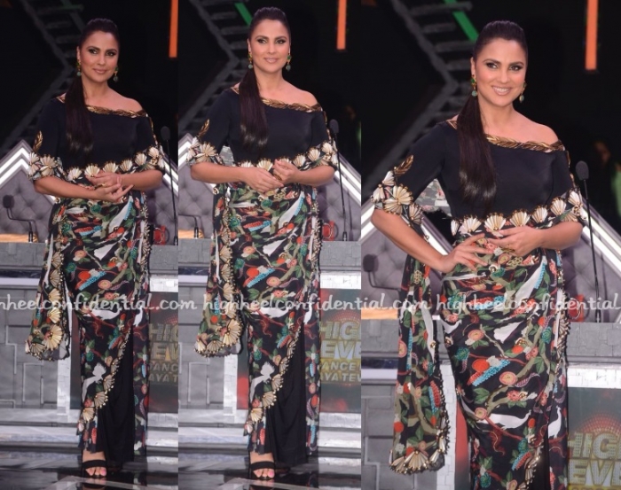Wearing a Shivan & Narresh sari, Lara taped an episode of High Fever on Thursday on which she serves as a judge. Now, Between the drape and the sari itself, I am sure many of you are screaming Shilpa Shetty already. Especially this and this.
