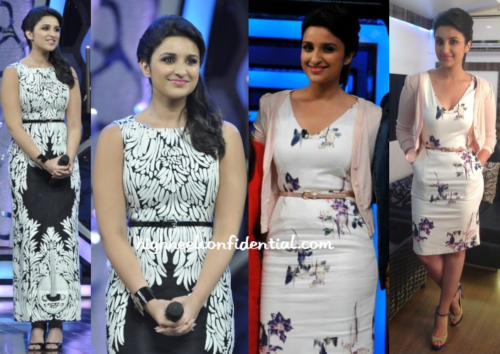 While on the sets of a television show promoting her movie recently, Parineeti was spotted in an Armani Jeans mesh-sleeved dress. Black pumps, belt and a cocktail ring finished out her look. She look good.
