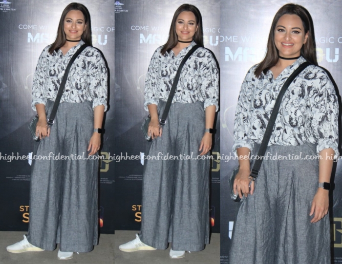 Sonakshi attended a movie screening keeping it casual in a printed shirt and grey pants paired with sneakers. Liked the off-duty outfit. The heavy handed concealer, not so much.