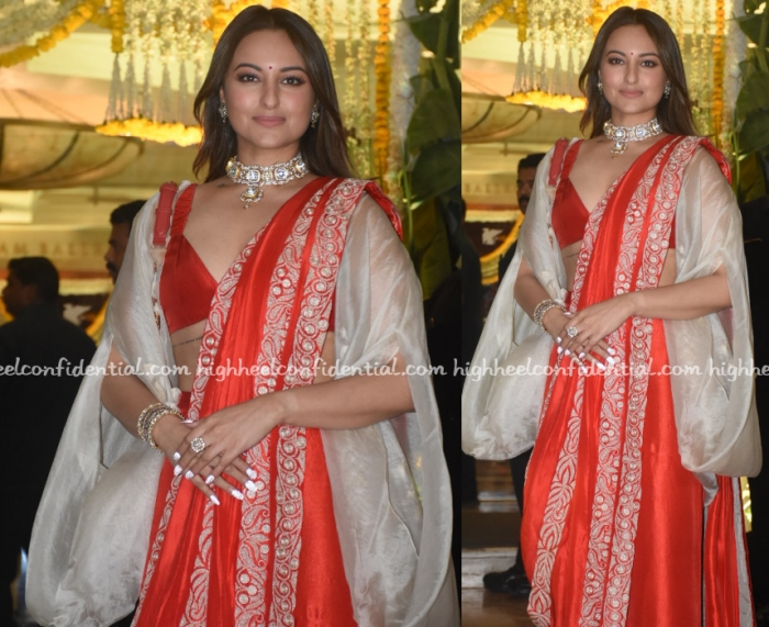 Wearing Anamika Khanna, Sonakshi Sinha attended the Trivedi-Mantena wedding reception on Sunday evening. The sari-pant set was one that we’d also seen on Katrina back in 2016 but minus the cape.