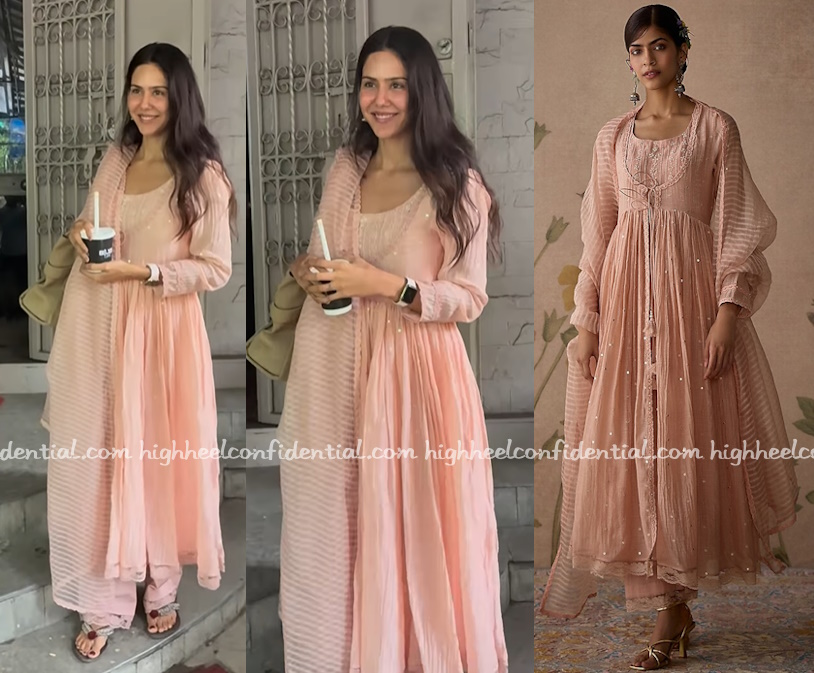 While leaving a dubbing studio, Sonam was spotted in a peach pink kurta set from Kritika Dawar. It ain’t the first time we are seeing her in one from the label. Cathc her other appearance here.