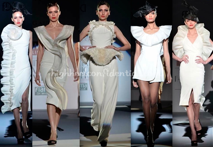 We’ve seen the designer duo experiment with draped ruffle trim since their Spring 2012 collection. But this time around, gone were colored gowns and in its place was a more dramatic take on the ruffle trip and an all-white collection with black accents. The thigh-high slit gown with sheer panel was an interesting surprise (Row Three).