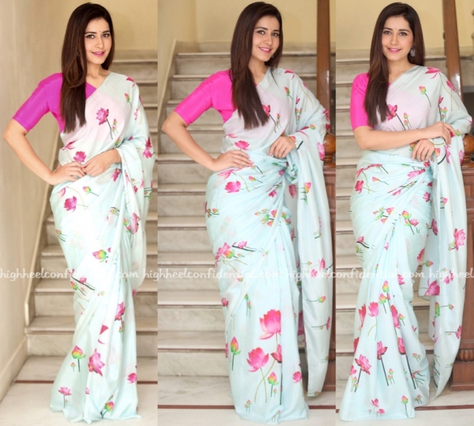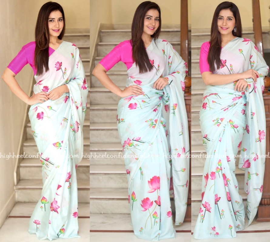 For a recent round of movie promotions, Raashi picked a Masaba sari to wear. Keeping things simple, she rounded out her look with a small bindi, pink lip color and pair of silver earrings. She looked nice!
