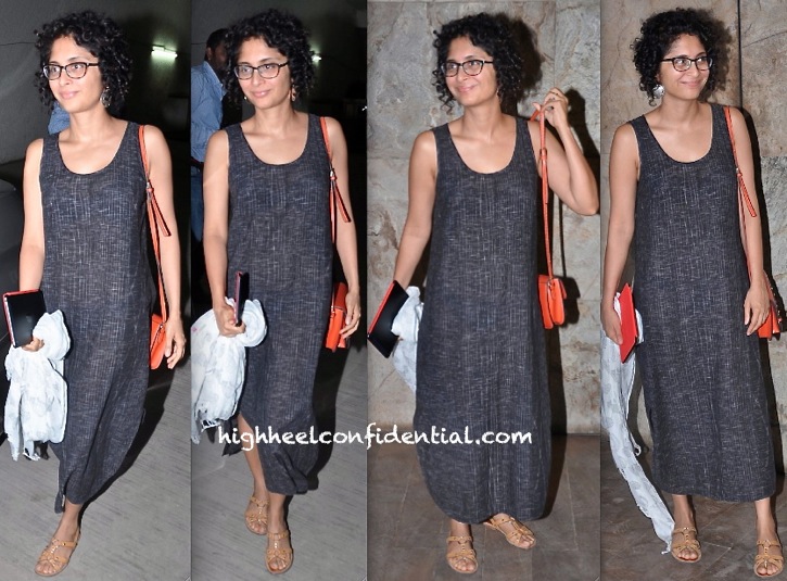 Keeping it simple in a dark grey dress, flats and a stole, Kiran attended a recent movie screening. Her orange bag added bit of a color to her outfit. Like her look at the movies?