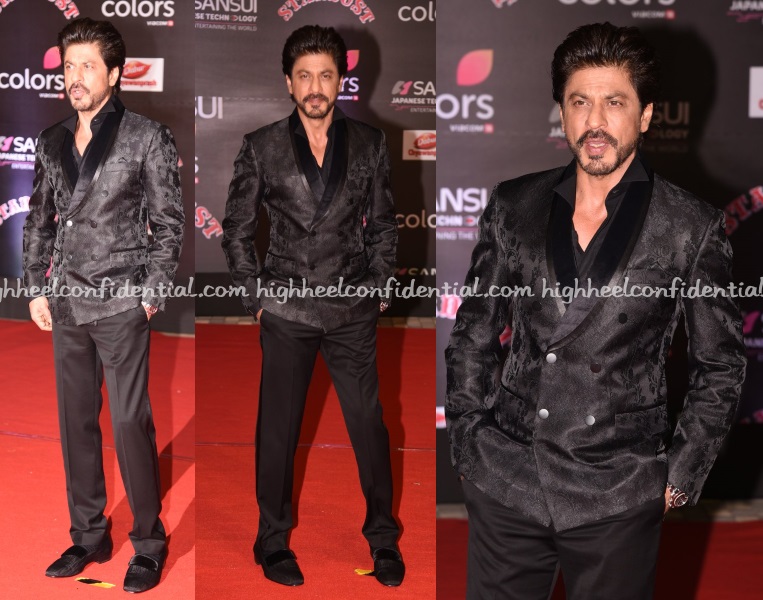 Back in Mumbai, Priyanka attended the Stardust Awards wearing an Anamika Khanna long jacket and pants from the Couture collection. A middle-parted ponytail and jewellery from Nirav Modi finished out her look.