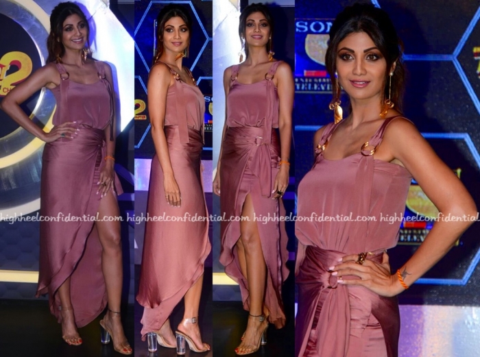 While at a press meet announcing the return of a reality show that she appears on, Shilpa was photographed in a Lola by Suman B dress. Suhani Pittie jewelry and Steve Madden sandals were among her accessories of choice.