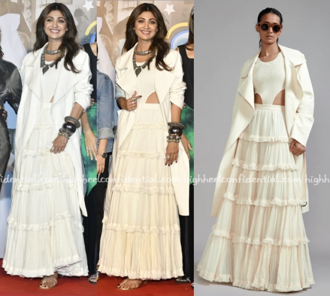 Wearing a bodysuit, skirt and jacket set from Mati, Shilpa attended the trailer launch of her upcoming movie on Wednesday with chunky silver necklaces and bracelets finishing out her outfit. I almost like the outfit when you can’t see those cutouts but it was a minor gripe. She looked nice here.
