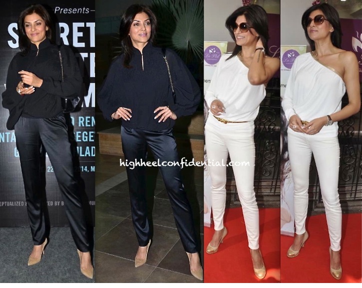Sushmita visited the Comedy Nights sets to promote her new fitness studio that incorporates exercise moves using aerial silk. For the appearance, she wore an applique top with black leather pants finishing out the look with tan and black cutout pumps.