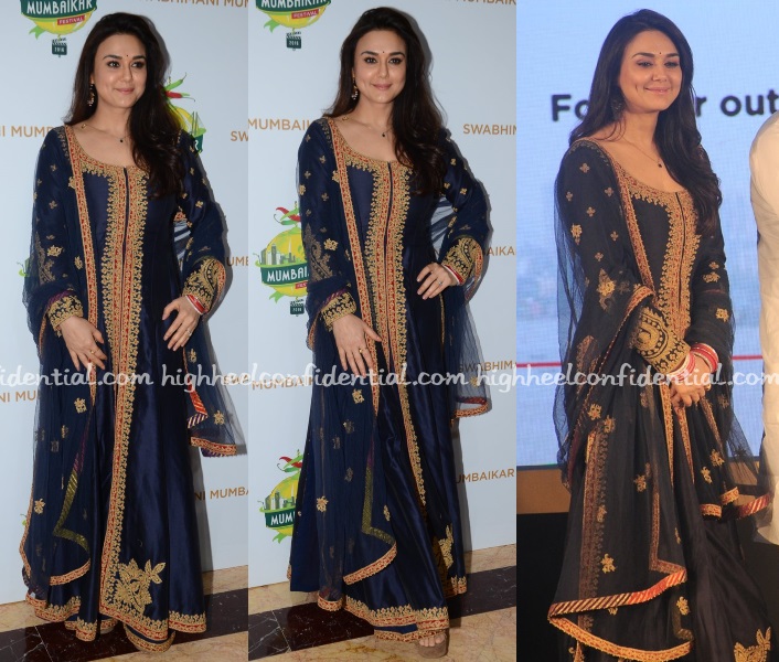 Preity attended the Swabhimani Mumbaikar event wearing a navy Rimple and Harpreet Narula long kurta and sharara. The outfit may not be my cup of tea but she looked sweet.