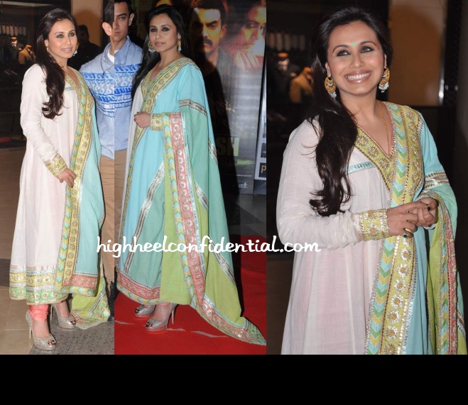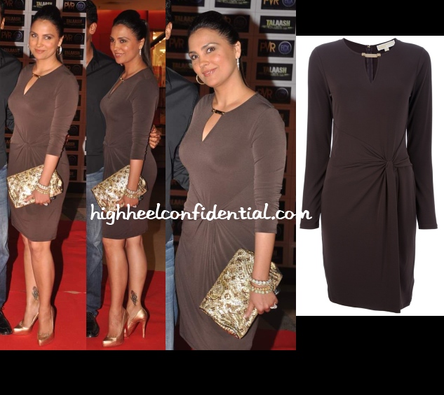 Wearing a figure-hugging Michael Kors dres that showed off her curves, Lara attended the Talaash premiere finishing out her look with a gold LV clutch and gold Loubs.