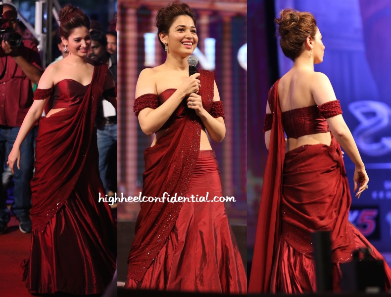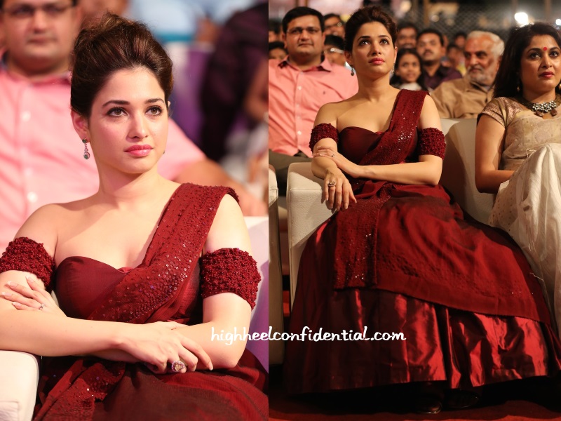 The audio launch of Baahubali saw Tamannaah in a Manish Malhotra lehenga featuring a strapless off-shoulder blouse. While I love the deep rich color, can’t say am in love with that blouse.