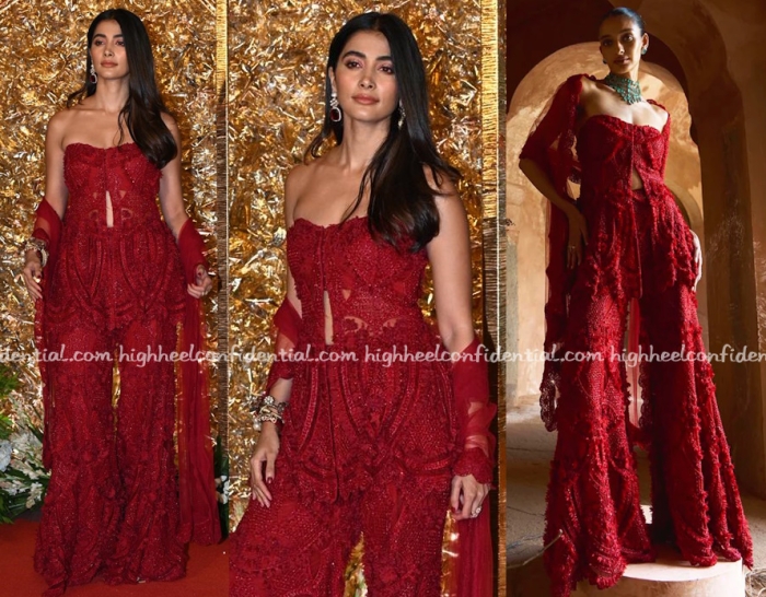 Pooja attended a Diwali party wearing a strapless top and sharara pants set from Ridhima Bhasin. The set was interesting but I think would’ve looked better with a neckpiece here.