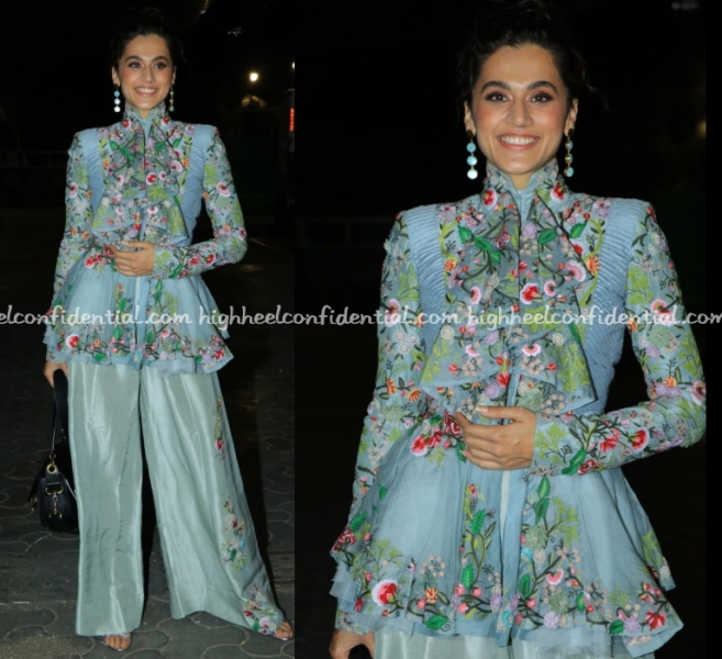 At the screening of Thappad, Taapsee was seen wearing a mint-ish green Anamika Khanna jacket and pant set. I don’t like the co-ords but she looked radiant nevertheless.