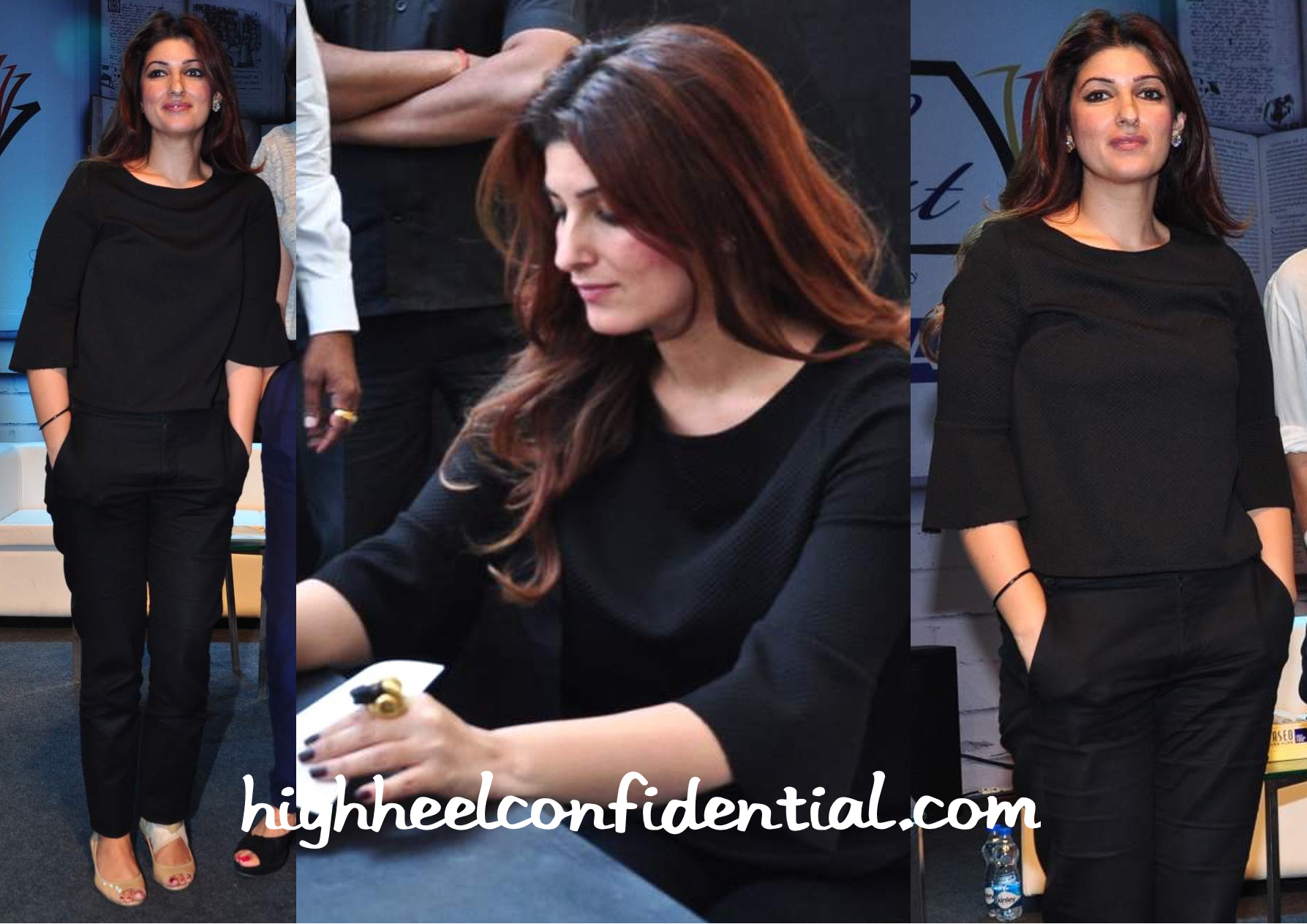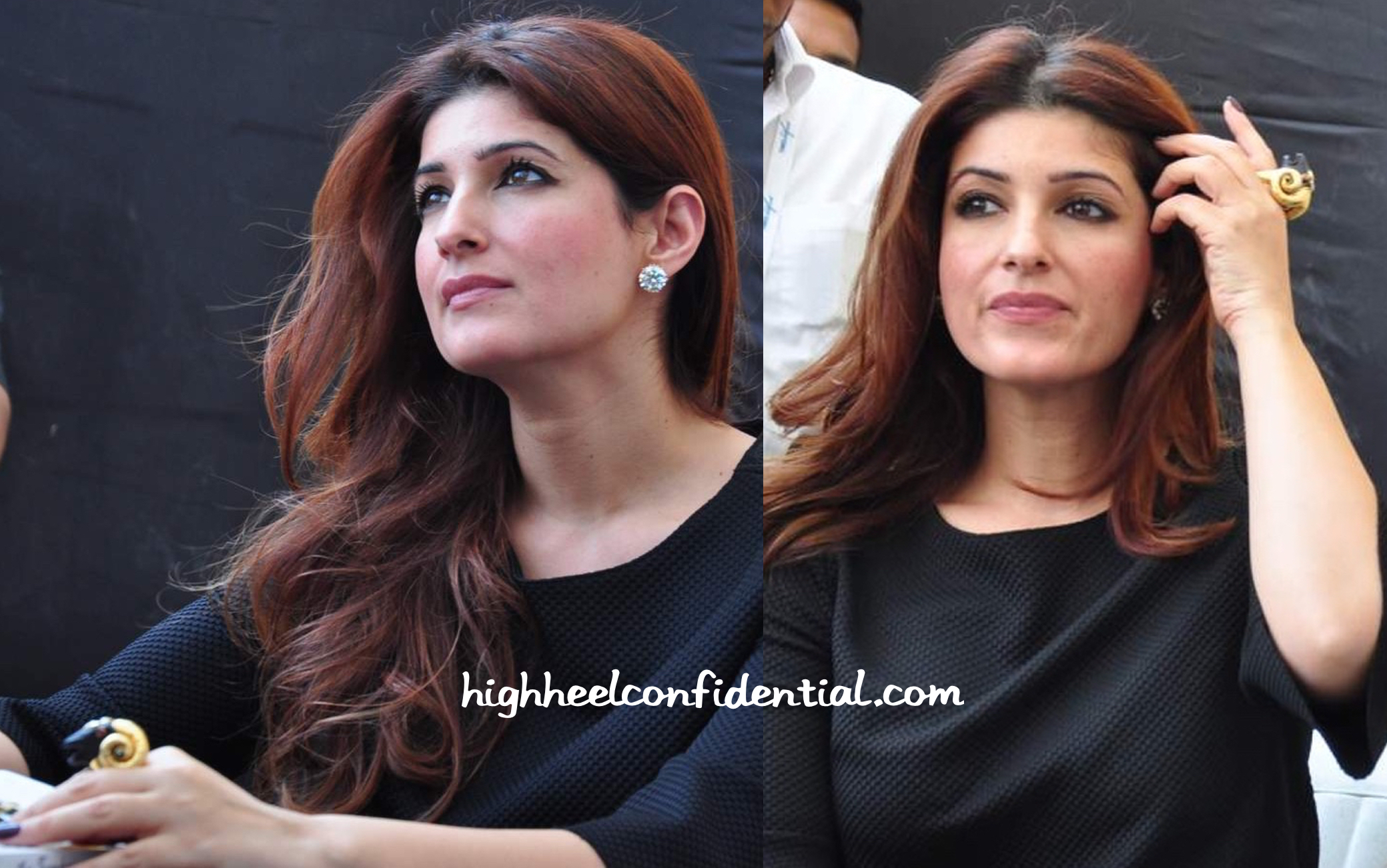 For her appearance at the Literary Festival in Mumbai, Twinkle kept it simple in black separates, neutral peep-toes and sparkling diamond solitaires. Of course, it wouldn’t be Ms. Khanna unless there was also one statement piece of accessory incorporated in to the look… In this case, it was the ram head ring doing the job. Love it!