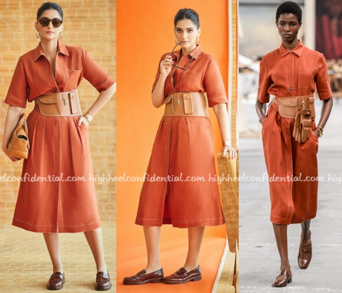 Prior to flying out of the city, Sonam did a photoshoot and a few interviews at the Tod’s store wearing a Spring 2024 look but swapping the shoes for loafers. The dress looked better on her than it did on the model. She looked great here.