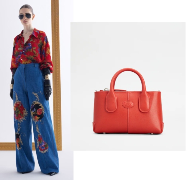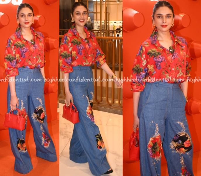 Wearing a floral shirt and denim embroidered pants from Rèik, Aditi attended the Tod’s store opening on Friday evening with the Tod’s Di bag finishing out her look.