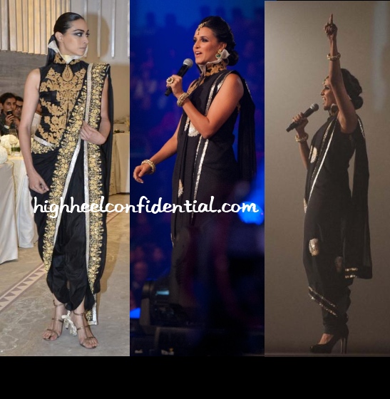 Chitrangda alongwith Karan Johar hosted TOIFA’s technical awards on Friday night in Vancouver. For her appearance, she picked a Gauri and Nainika gown featuring a ruffled white top and a velvet black skirt.