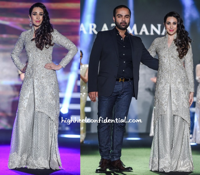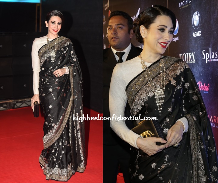 Karisma, who walked for designer Faraz Manan on day one of TOIFA, attended the main awards nights wearing a Sabyasachi sari and clutch with jewellery from Amrapali.