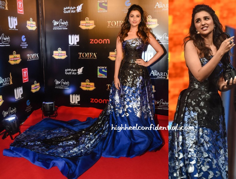 On day two of TOIFA, Parineeti went strapless again, wearing a Georges Chakra. Letting the shimmery gown with its endless train be the highlight of the look, she finished out her red carpet look with a subtle ring and studs.