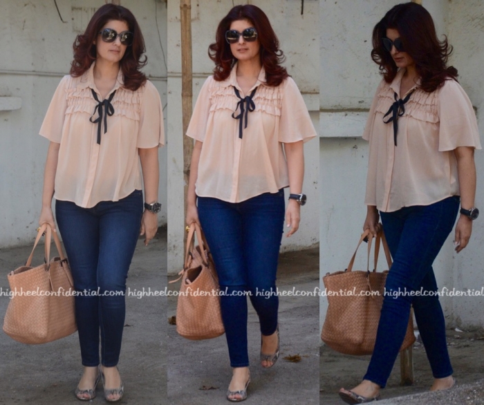 As she was out and about, Twinkle was photographed in a Zara top, one that she paired with dark-wash skinny jeans. Her choice of accessories included a roomy Bottega Veneta tote.