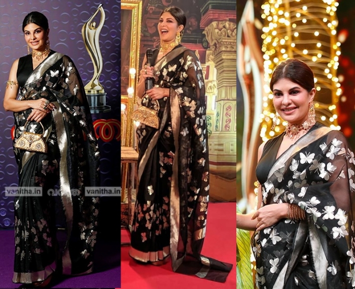 Jacqueline attended the Vanitha Awards in Cochin last month wearing an Ekaya sari with jewellery from Amrapali. Given the sari’s distinctive silver motifs, the gold jewellery didn’t seem to work with it. What say you?