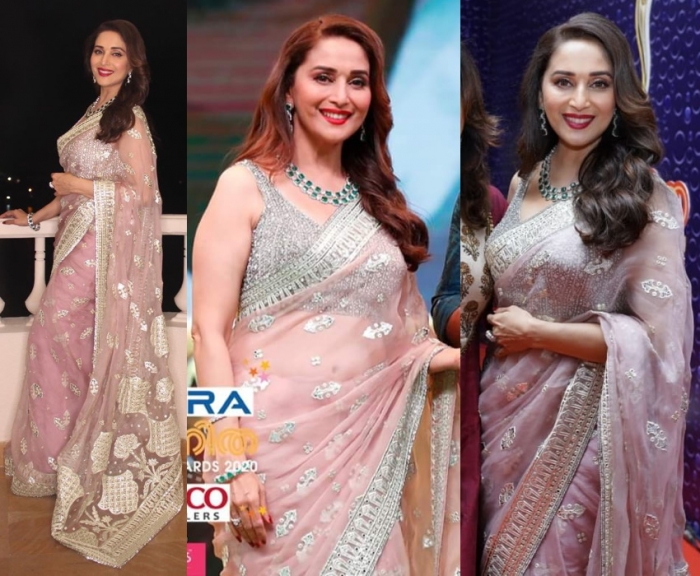 Madhuri attended the Vanitha Awards last month wearing a light pink sheer sari by Falguni and Shane Peacock. Like the sari?