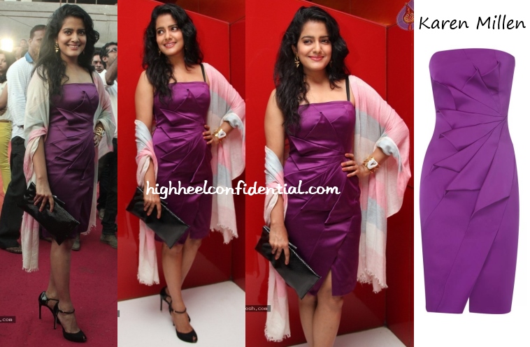Vishakha attended the premiere of Arima Nambi wearing a purple Karen Millen. The strapless dress comes with optional straps which Vishakha chose to wear. The problem with her look was the accesories. Between the black clutch/sandals, the gold jewellery and the addition of the printed stole, the look got too busy and felt disconnected.