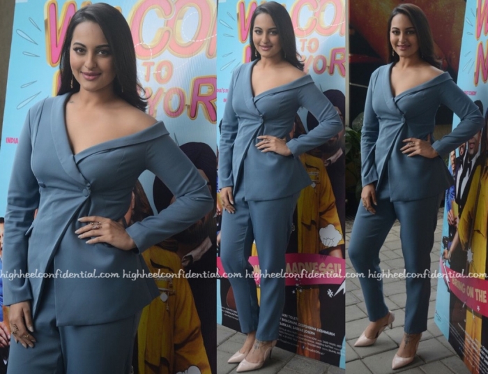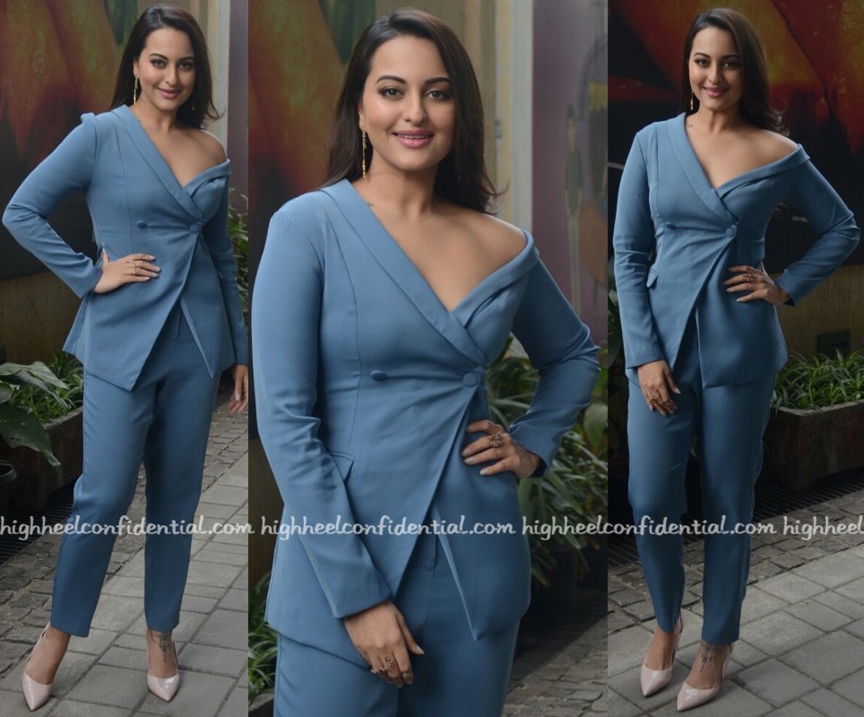 Wearing Zara, Sonakshi attended an event to promote her latest movie. Pair of black pumps and jewelry from Flowerchild rounded out the actor’s look.
