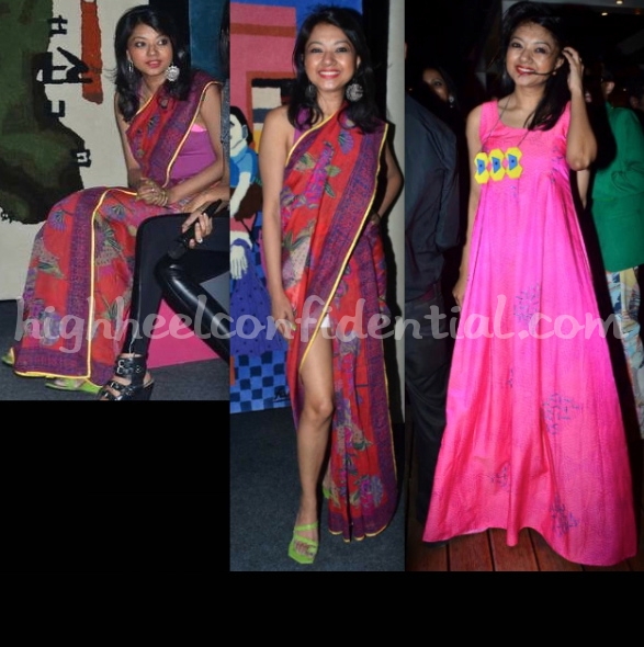 While taking in one of the shows during FW, designer Anupama Dayal paired a sari over a tank and white shorts. Funky but looks très uncomfortable.