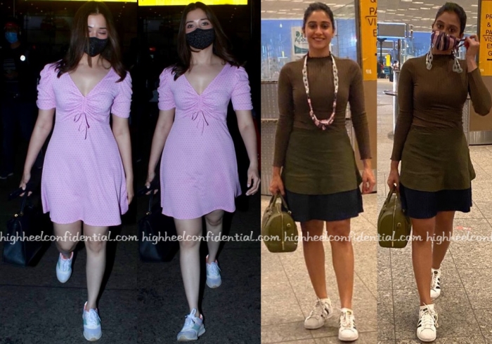 While at Mumbai airport, Tamannaah and Regina were photographed keeping things casual with their choice of outfits for travel. Both ladies rounded out their looks with the all important mask, trusty white sneakers and roomy bags.