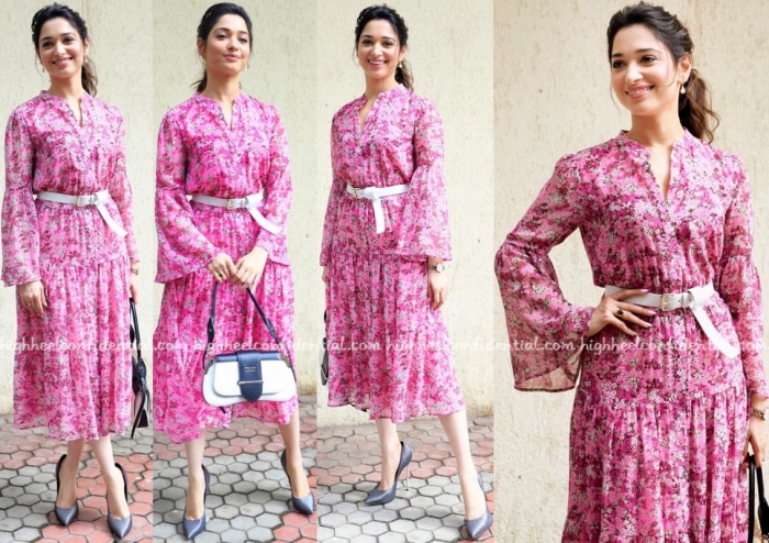 For a round of interview recently, Tamannaah picked a pink floral-print dress to wear. With a belt adding some definition, she rounded out her look with a Prada bag and pair sky-high pumps. She looked nice.