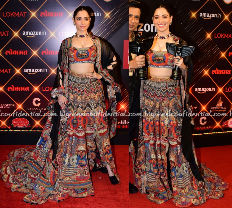 Also wearing Anamika Khanna was Tamannaah, who opted for one from the designer’s heavily embroidered collection. The outfit itself was pretty and she looked nice but as one can see, the lehenga skirt was too long for her. Even with those chunky platform sandals, the skirt seemed to pool.