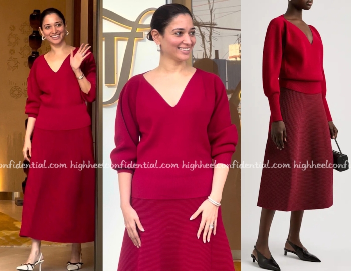 Tamannaah was spotted at work at her jewellery store keeping it simple in a Simkhai top and skirt paired with her own jewellery and monochromatic pumps. I liked this slightly styled but casual look on her.