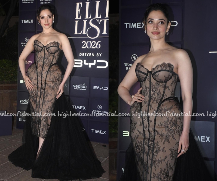 Tamannaah attended an event last week wearing a strapless body hugging dress from Surya Sarkar and while the dress portion of it was striking and she looked good, that black tulle train seemed such an unnecessary design addition. Just me feeling that way?