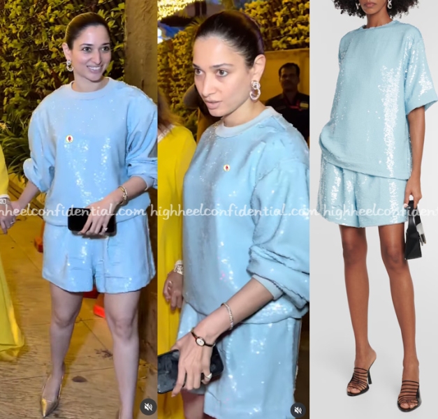 Tamannaah was spotted having dinner with her parents Sunday evening wearing a sequin sweatshirt and shorts set from The Frankie Shop finished out with metallic silver pumps and her hair in a knot. She looked nice in it.