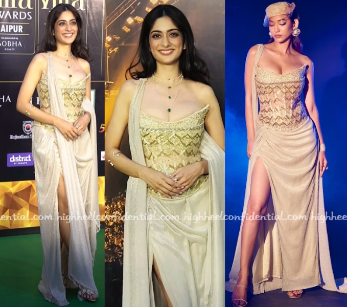 Tanya was seen in a gold corset and draped skirt set from Vesture at the IIFA Awards which she wore with a nose-ring and dainty layered pearl and emerald necklace. The outfit ain’t my cup of tea but the bigger issue here was the fit. The corset felt too snug and a bit too low.