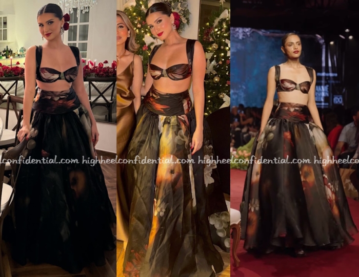 Tara hosted a Christmas party for her friends and was seen wearing a Gauri and Nainika bustier top and skirt with her hair in an updo complete with a rose. It’s not like she looked bad but this felt like an odd choice for a Christmas party. Just me feeling that way. I can see this being worn at a beachside/poolside event.