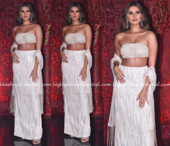 Wearing a Manish Malhotra creation, Tara attended Karan’s birthday soiree on Wednesday evening. These bandeau tops and column skirt looks (which in themselves are very Kim K inspired) are ones Ms. Sutaria seems to favor. Can’t say I care for this look.