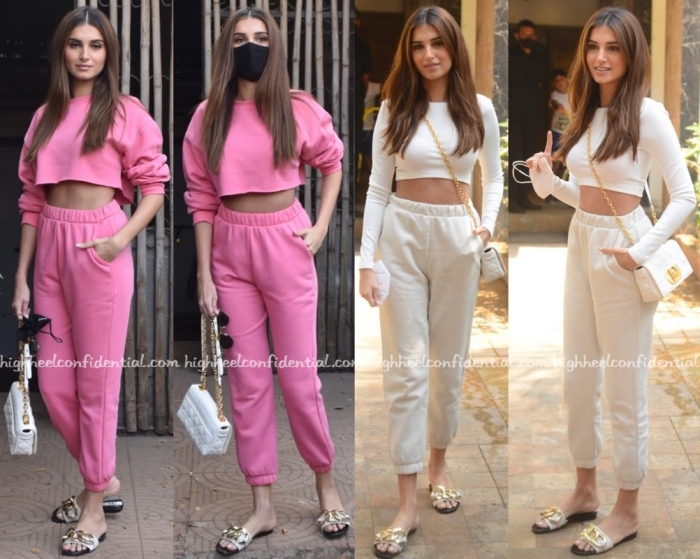 While out in Mumbai, she was photographed in matching sets of activewear on two different occasions. Both times she rounded out her look with a Dior bag and pair of chain-link embellished slides. After back-to-back sightings of Tara’s in kaftans and kurtas, this was an interesting change of pace.