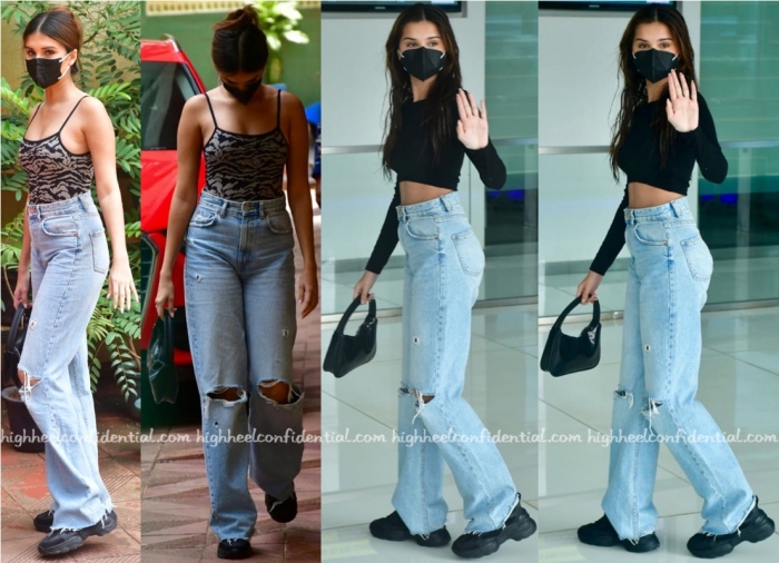 Teaming her high-waisted distressed denims with a printed bodysuit one time and a crop-top at another, Tara stepped out in Mumbai recently. Both times she rounded out her look with a black shoulder bag and pair of chunky sneakers. Like what you see?