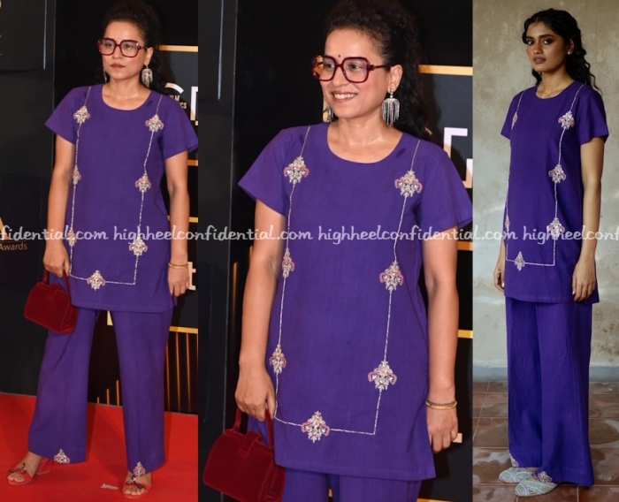 Tillotama opted for a co-ord set from Open Form to wear to an awards event on Tuesday evening pairing it with a felt burgundy top bag, long earrings and red sandals. I quite liked the art deco inspired set but didn’t think the bindi here was needed. But, Ms. Shome likes to add her own quirk to looks so I don’t mind it.
